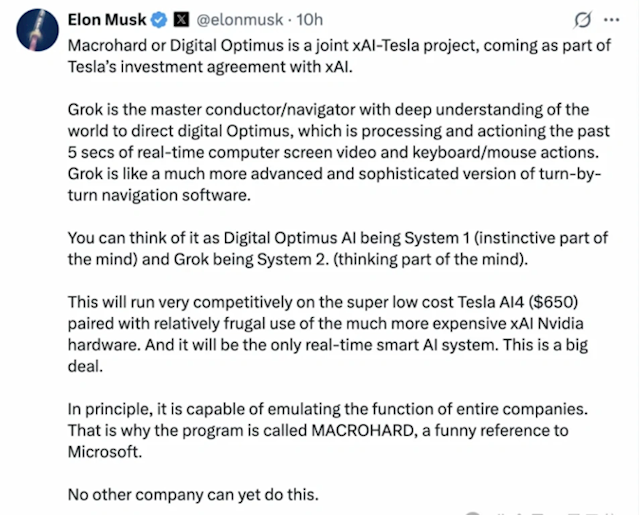 快科技3月13日消息,据媒体报道,埃隆·马斯克宣布启动一项名为“数字擎天柱”(Digital Optimus)/“巨硬”(Macrohard)的创新项目。