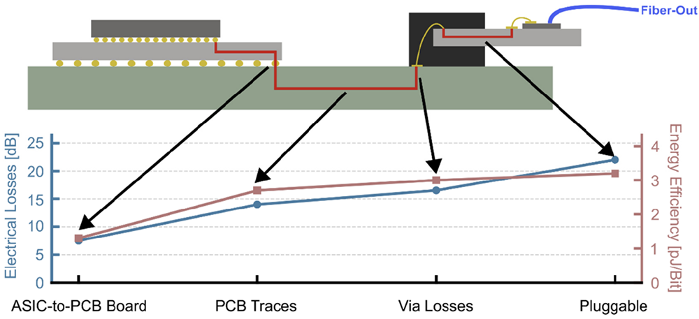 传统可插拔光模块中,DSP(数字信号处理器)消耗整个模块约50%的电能。CPO将光学器件从前面板迁移至有机衬底,极大缩短芯片间电链路,将系统级功耗压缩至更低极限,从而把宝贵的电力预算归还给GPU。
